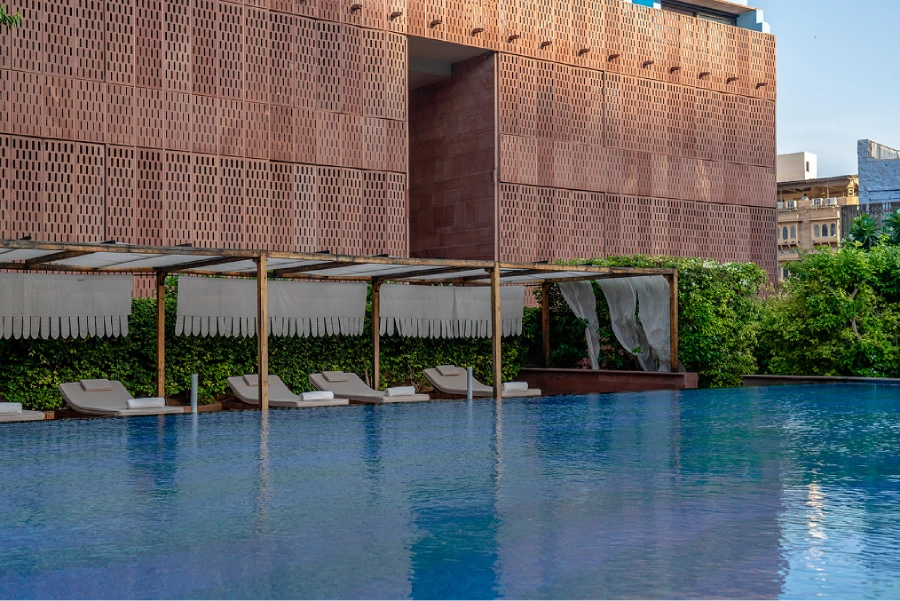 Intricate architectural carvings adorn the structure in the iconic style of 18th-century havelis. Jodhpur’s red sandstone unites the old and the new with the contemporary designs adding an exciting and fresh dimension to the region’s ancient carving industry.