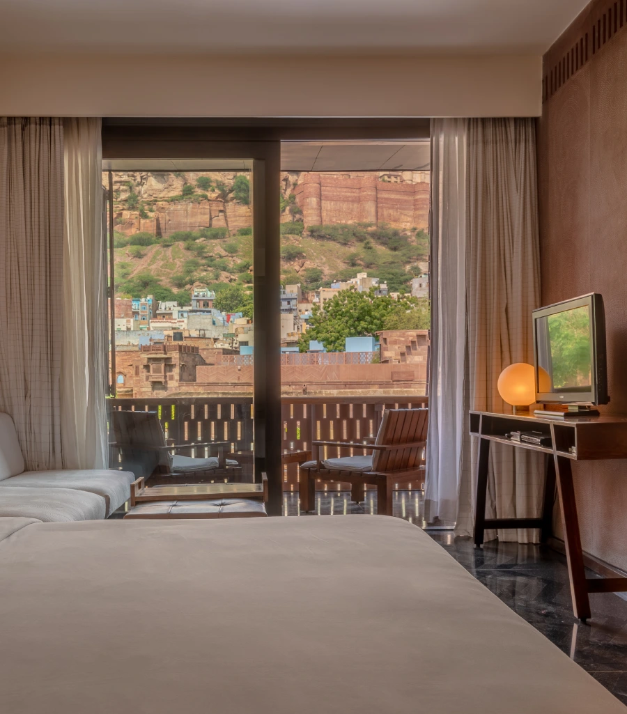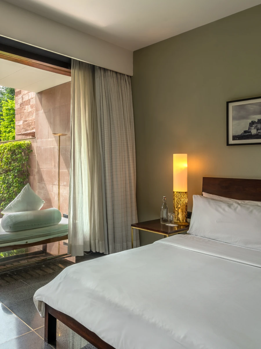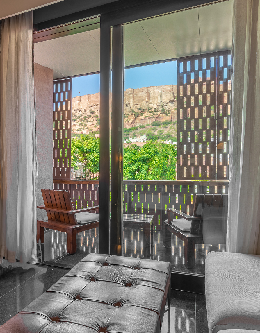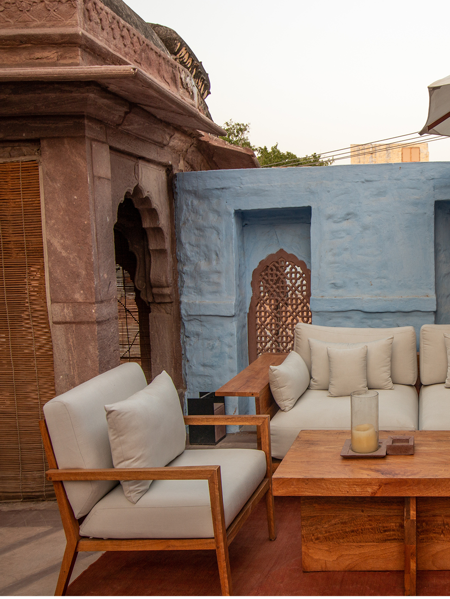 The hotel has forty rooms and suites, each of which had been constructed to our distinctive design principles. Our signature style balances the historic charm of the original Rajput residence and the sleekness and simplicity of contemporary design. Modern artwork and age-old pink sandstone blend in perfect combination, interspersed with polished black terrazzo and flashes of Jodhpur blue. This magical atmosphere allows guests to enjoy the royal splendour of bygone years, whilst simultaneously being treated to the luxuries of the modern age. Each room boasts ample space and luxury amenities. If you explore our different rooms, you are sure to find the one that suits your tastes.