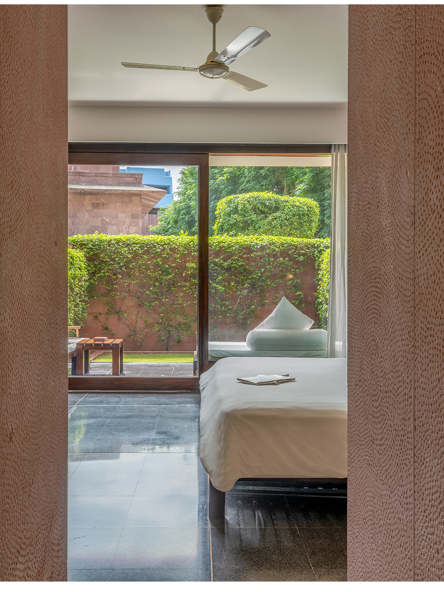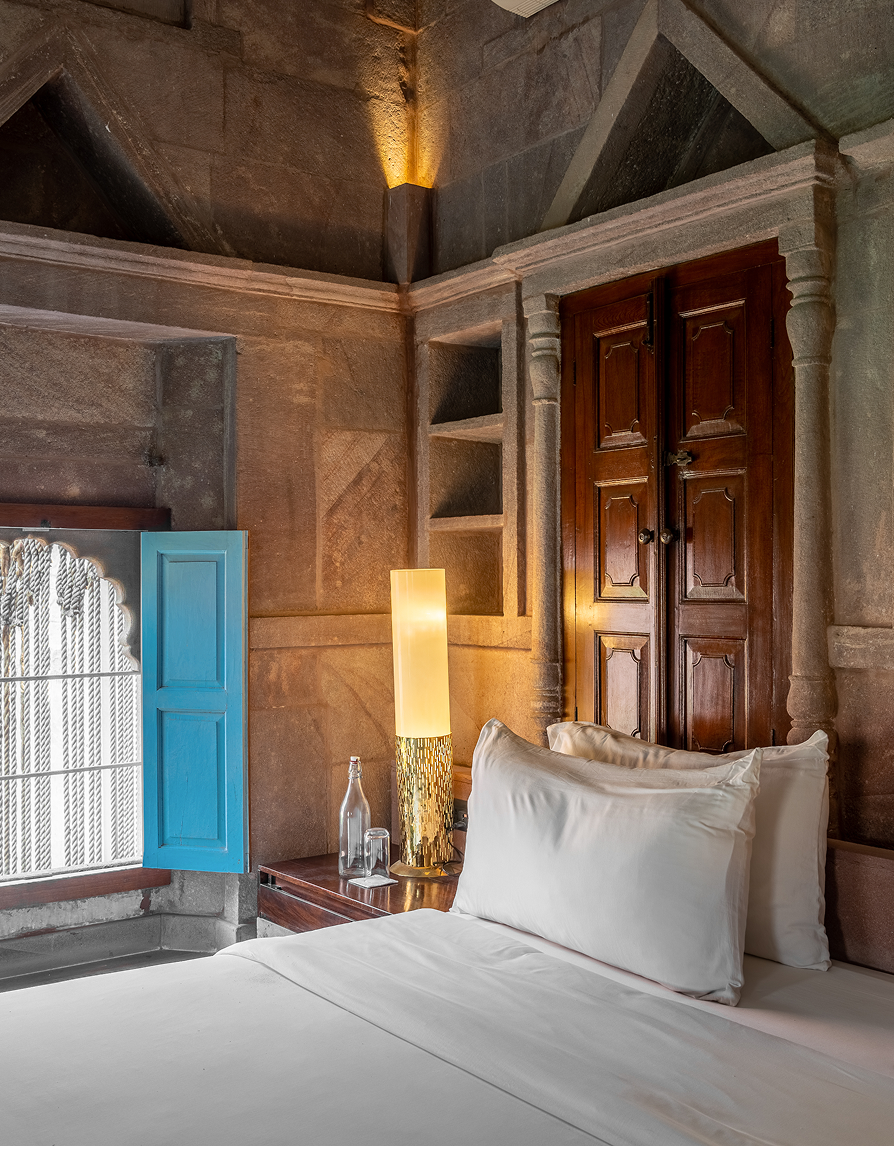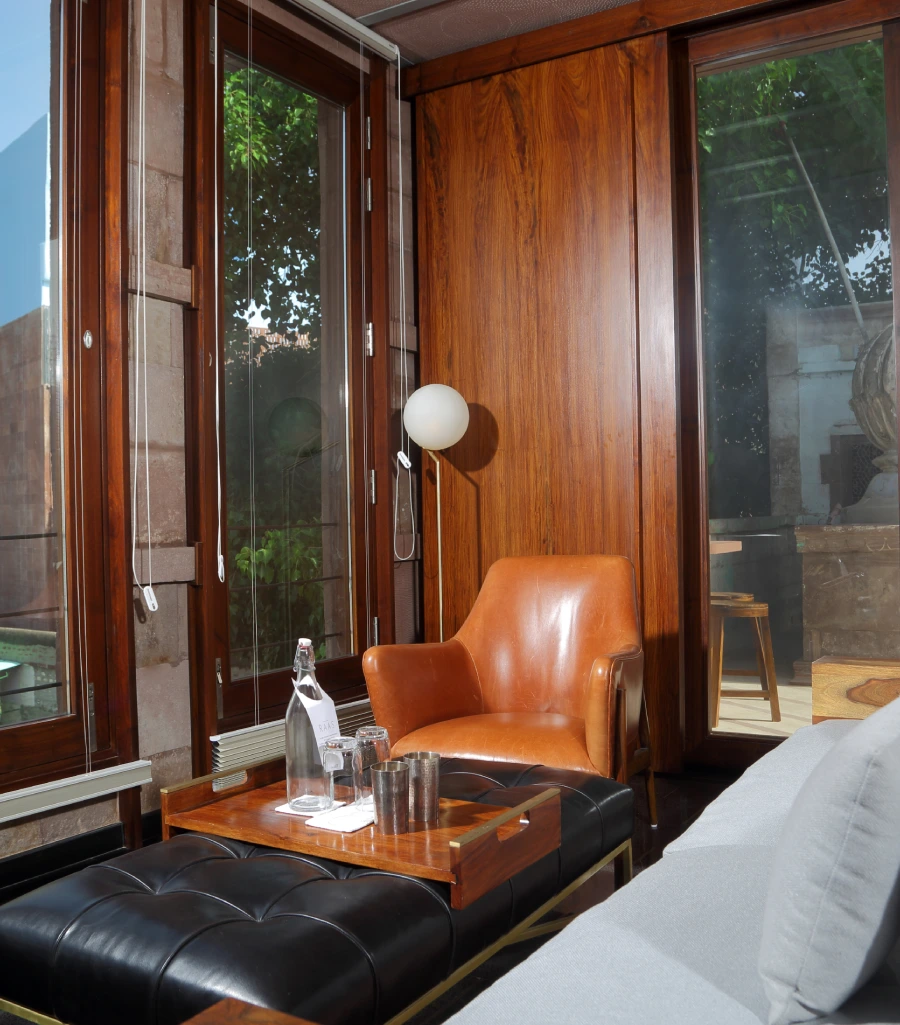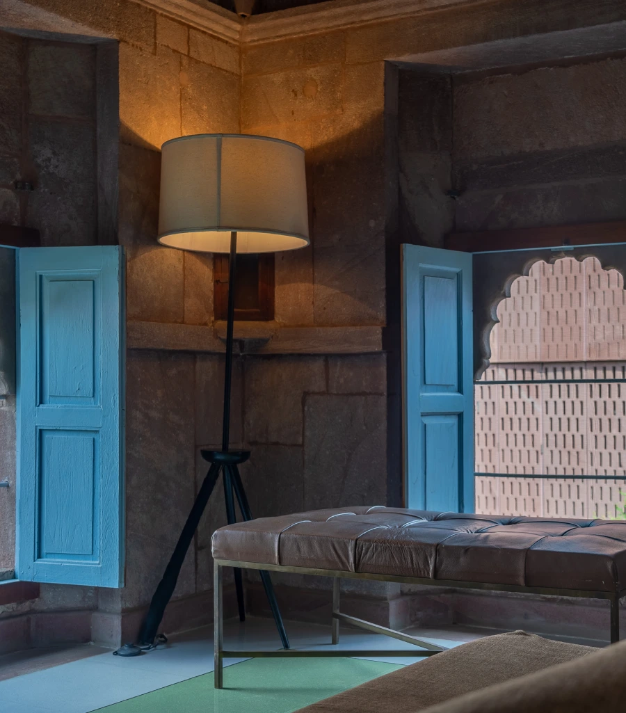 The hotel has forty rooms and suites, each of which had been constructed to our distinctive design principles. Our signature style balances the historic charm of the original Rajput residence and the sleekness and simplicity of contemporary design. Modern artwork and age-old pink sandstone blend in perfect combination, interspersed with polished black terrazzo and flashes of Jodhpur blue. This magical atmosphere allows guests to enjoy the royal splendour of bygone years, whilst simultaneously being treated to the luxuries of the modern age. Each room boasts ample space and luxury amenities. If you explore our different rooms, you are sure to find the one that suits your tastes.