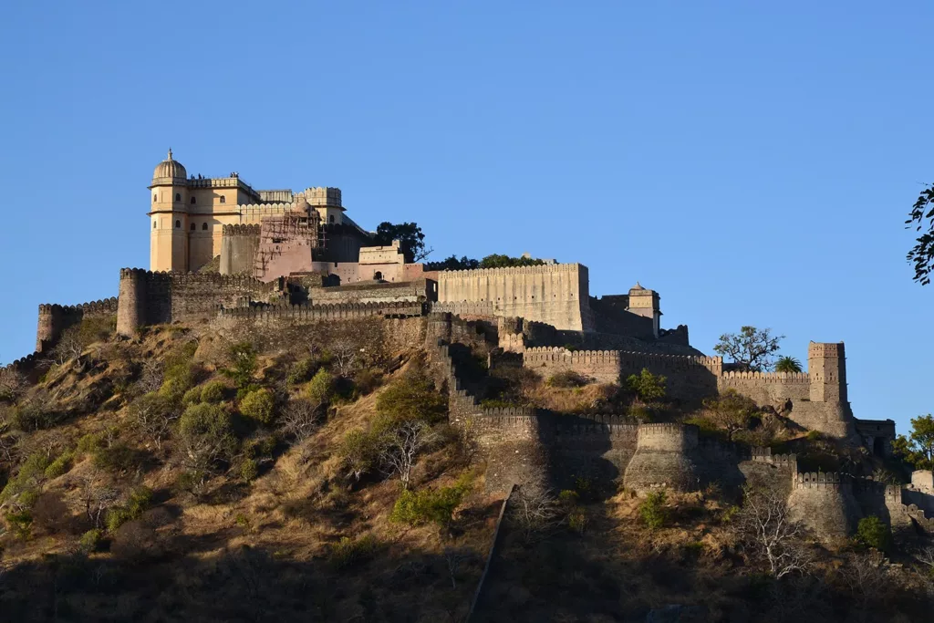 If you’re willing to take a more scenic route, you can make a day of it and take a detour to the incredible temples of Ranakpur and Kumbhalgarh. About three hours from Jodhpur is Ranakpur and the drive, through the Rajasthani countryside and the Aravalli hill range, is beautiful. Ranakpur is famous for having the most spectacular of Jain temples in the area. Non-Jains can only visit the temples after noon, so we advise you not to leave from Jodhpur too early. Jainism is one of the ancient religions of India, which holds at its core a belief in non-violence. This extends to a specific diet, Jain vegetarianism that, among other things, excludes root vegetables because to eat them requires the killing of the plant. It also means that leather objects cannot be taken into their temples. The complex is home to many temples, the largest of which, Chaumukha Mandir, is a complicated series of 29 halls, 80 domes and 1444 individually engraved pillars. The intricacy of the structure is a testament to the 65 years that it took to build. The place is also famous for its large population of monkeys that live in and around it. Once you have explored the site, a further one-hour drive will take you to Kumbalgarh Fort.