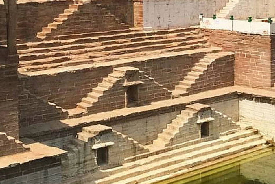 Toorji Ka Jhalra (Toorji’s Stepwell) was built in the 1740s by the Queen (Maharaja Abhay Singh’s Consort). Interestingly, this Tanwar (Toor) Rajput Princess hailed from Patan in Gujarat, home to perhaps the finest Stepwell in the country. It was an age-old tradition that Royal women would build public water works. Indeed, for women, fetching and storing water was, and remains for many, one of the principal house-hold chores.
