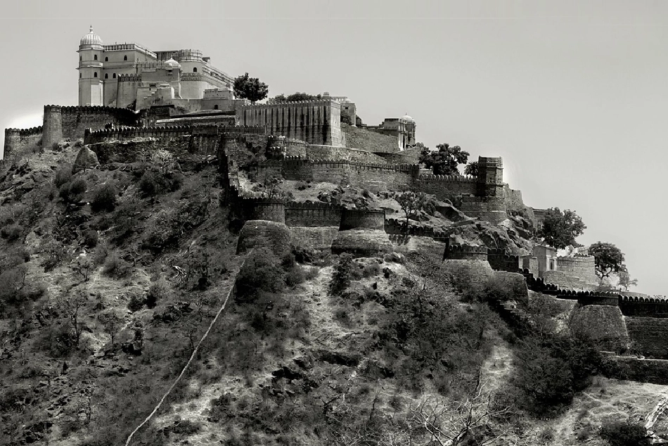 If you’re willing to take a more scenic route, you can make a day of it and take a detour to the incredible temples of Ranakpur and Kumbhalgarh. About three hours from Jodhpur is Ranakpur and the drive, through the Rajasthani countryside and the Aravalli hill range, is beautiful. Ranakpur is famous for having the most spectacular of Jain temples in the area. Non-Jains can only visit the temples after noon, so we advise you not to leave from Jodhpur too early. Jainism is one of the ancient religions of India, which holds at its core a belief in non-violence. This extends to a specific diet, Jain vegetarianism that, among other things, excludes root vegetables because to eat them requires the killing of the plant. It also means that leather objects cannot be taken into their temples. The complex is home to many temples, the largest of which, Chaumukha Mandir, is a complicated series of 29 halls, 80 domes and 1444 individually engraved pillars. The intricacy of the structure is a testament to the 65 years that it took to build. The place is also famous for its large population of monkeys that live in and around it. Once you have explored the site, a further one-hour drive will take you to Kumbalgarh Fort.