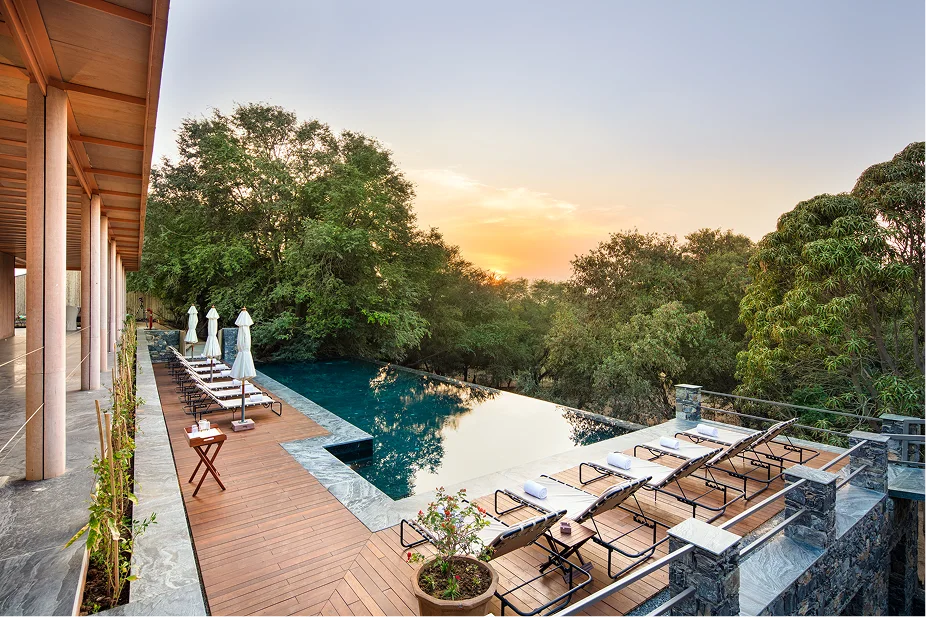 RAAS Devigarh is a secluded, minimalist fort palace tucked away in the Aravallis Hills.