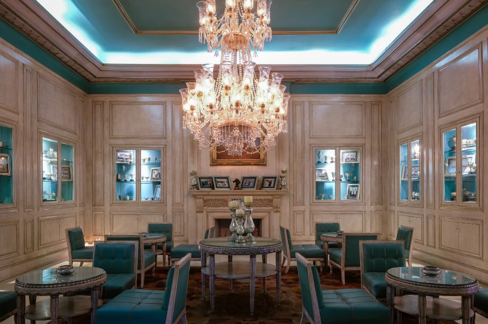 Transformed from a library, this majestic lounge features a stunning Tiffany Blue aesthetic and low seating. Adorned with the Royal Family’s most treasured polo memorabilia, it has become one of Jaipur’s most sought-after spots.