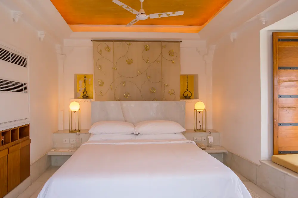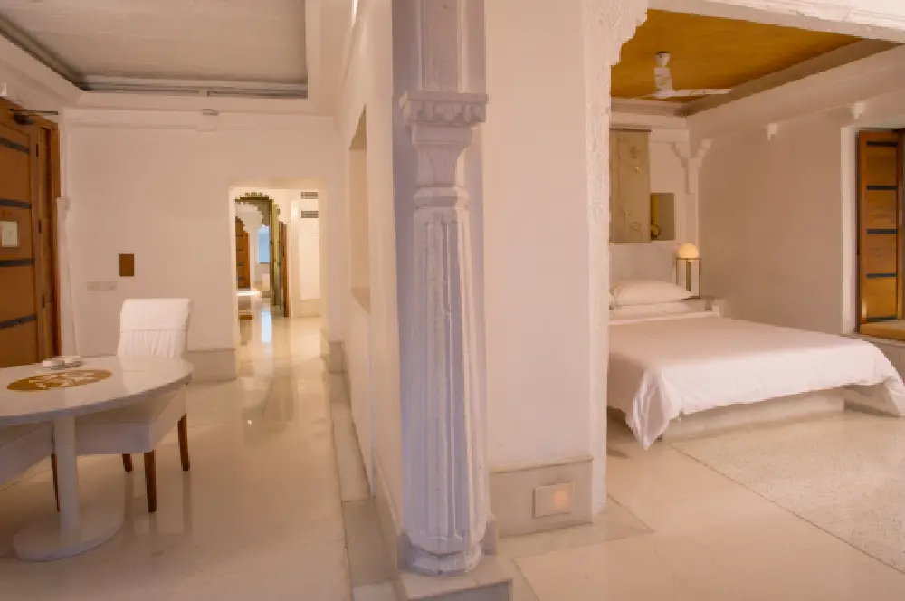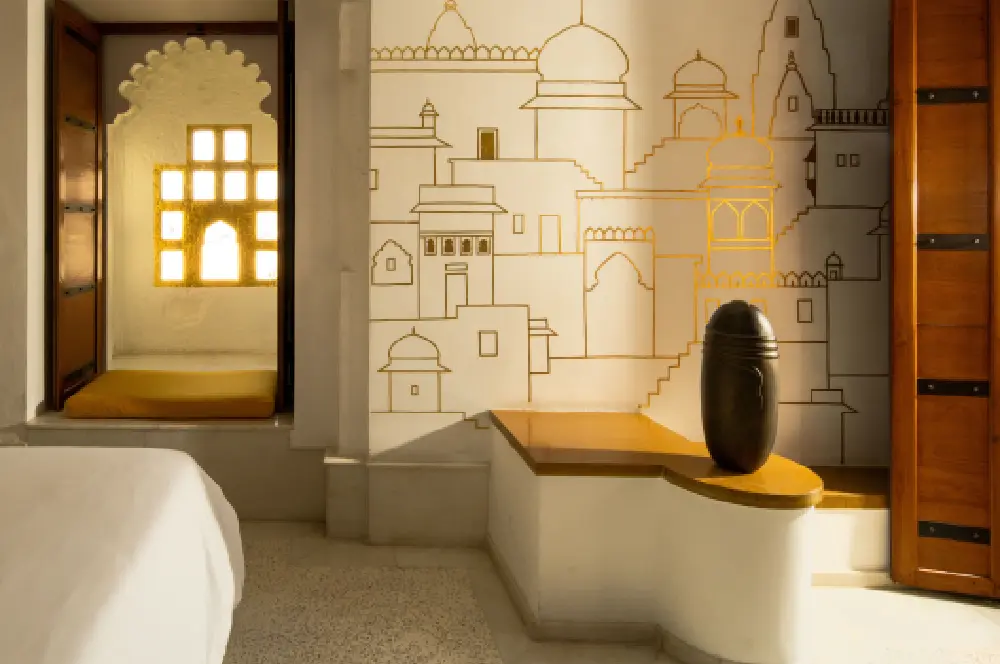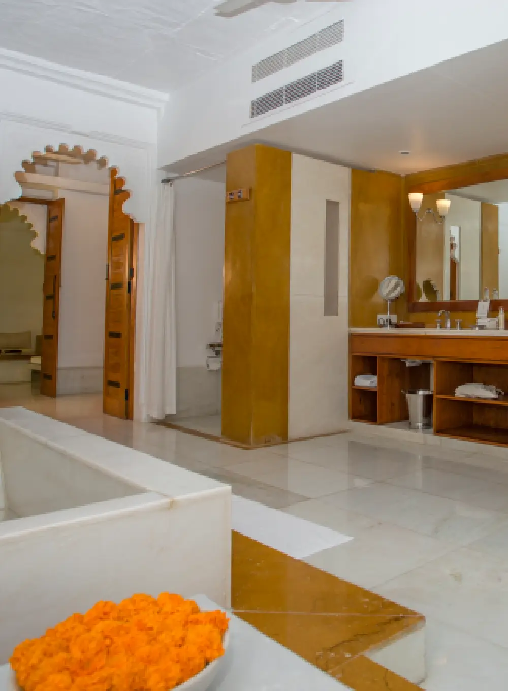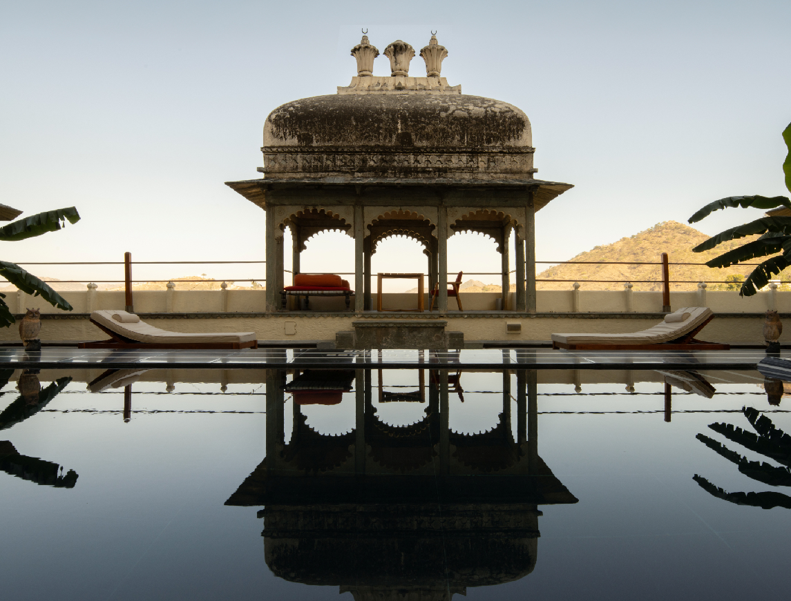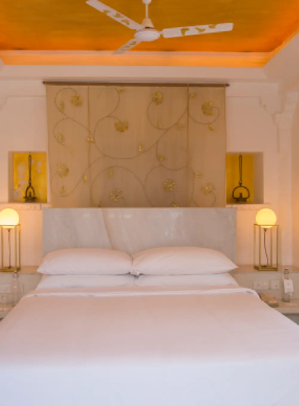 The Devigarh Complex caters for your every need, and does so in style. The captivating golden bedroom extends onto a private sun deck and jacuzzi where guests can revel in the perfection of our most esteemed suite. This complex includes a private black granite pool and room enough to enjoy a secluded dining experience beside it. The complex combines this suite with one of our Aravali Suites, which adjoins the pool area and accommodates 4 adults and 2 children, up to 12 years of age. The theme of the complex is inspired by the divine bond between Shiva, Shakti, and his beloved vahana [steed], Nandi.