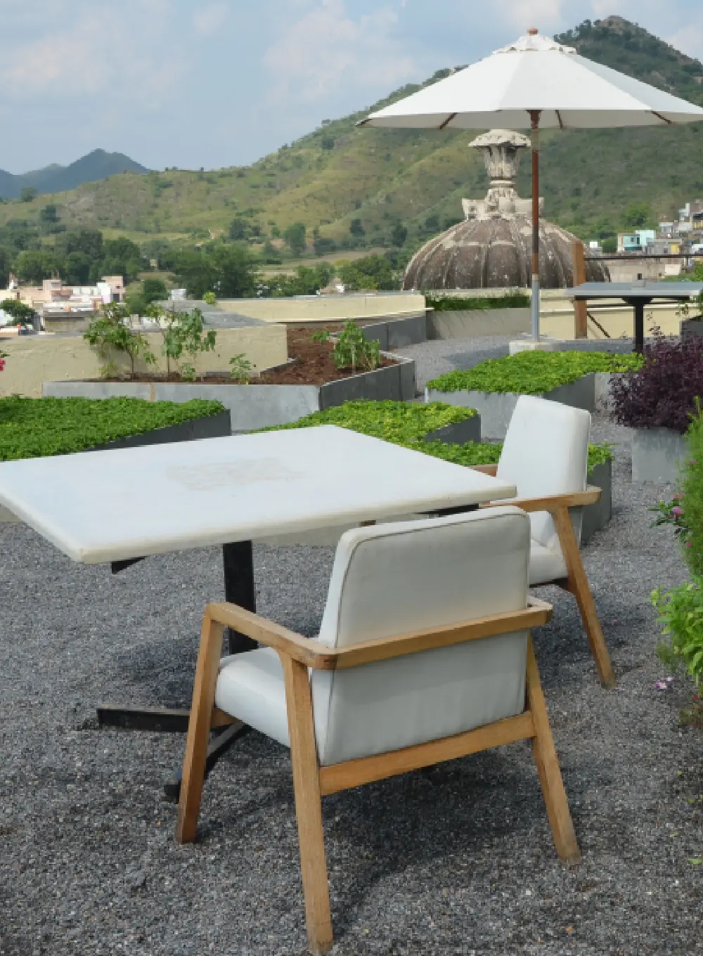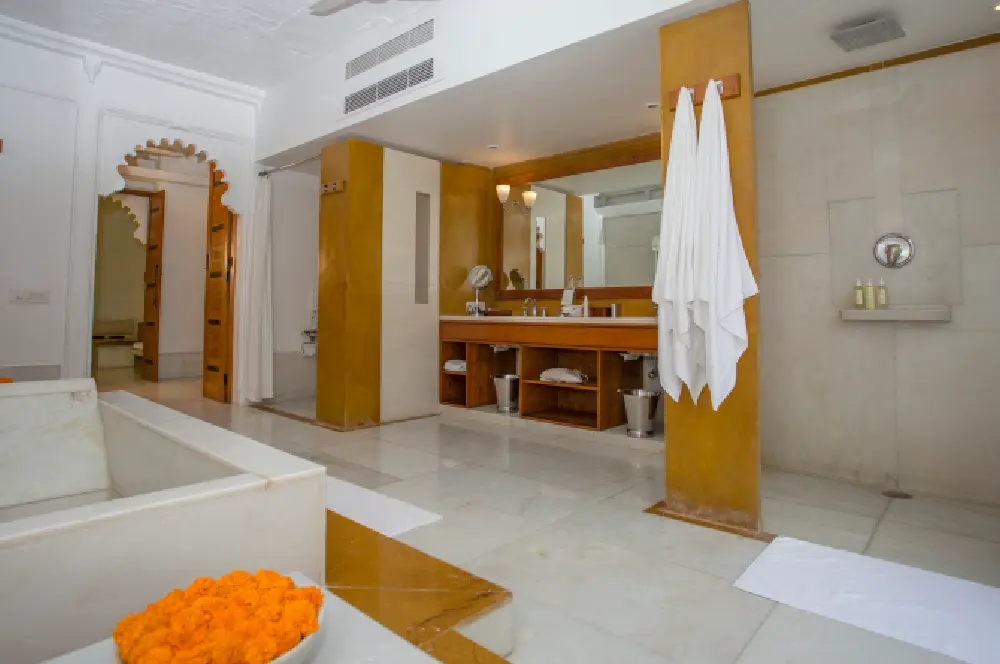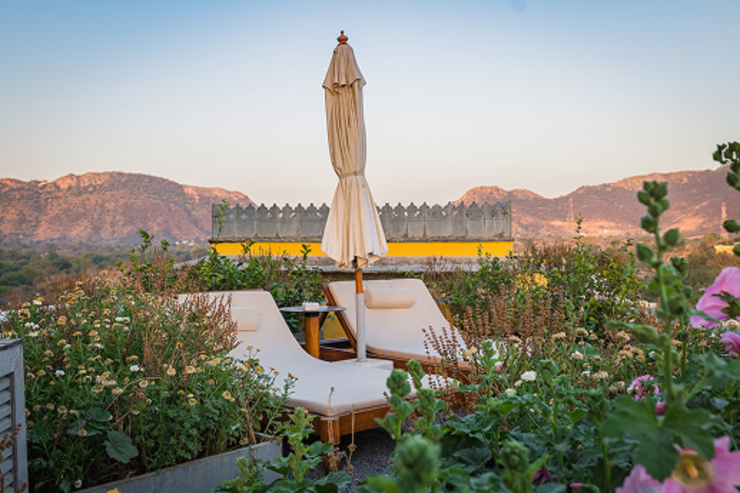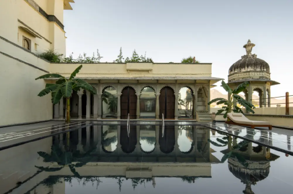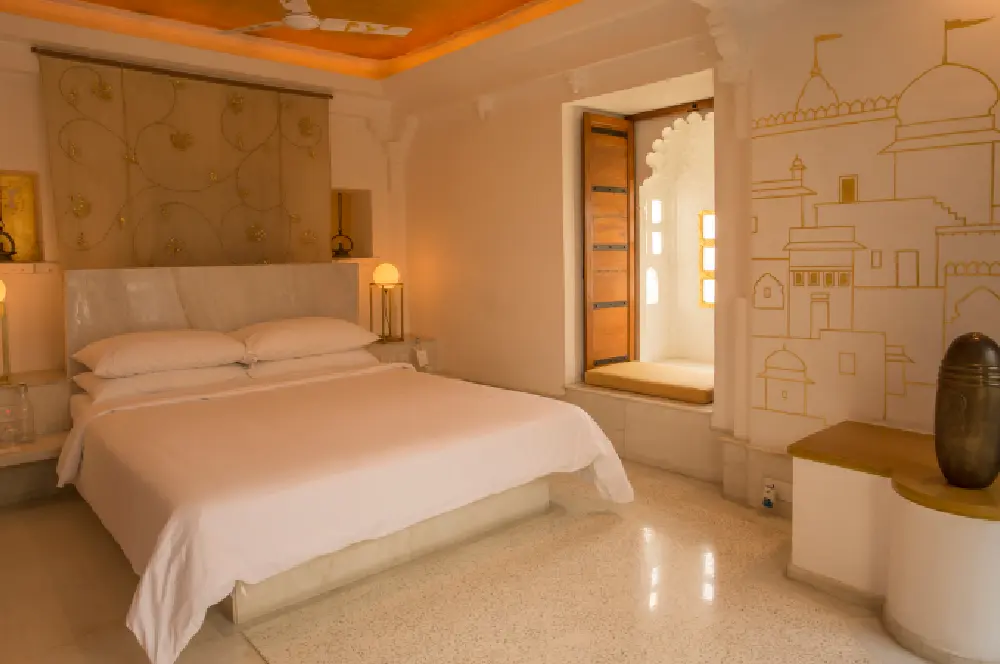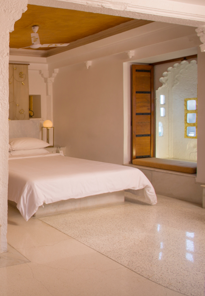 The Devigarh Complex caters for your every need, and does so in style. The captivating golden bedroom extends onto a private sun deck and jacuzzi where guests can revel in the perfection of our most esteemed suite. This complex includes a private black granite pool and room enough to enjoy a secluded dining experience beside it. The complex combines this suite with one of our Aravali Suites, which adjoins the pool area and accommodates 4 adults and 2 children, up to 12 years of age. The theme of the complex is inspired by the divine bond between Shiva, Shakti, and his beloved vahana [steed], Nandi.
