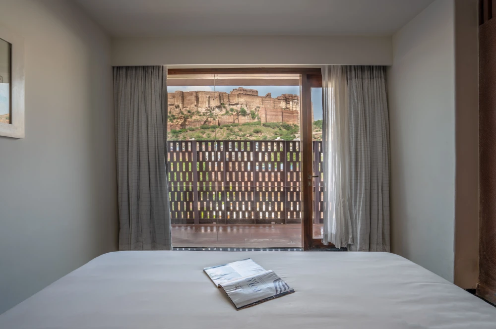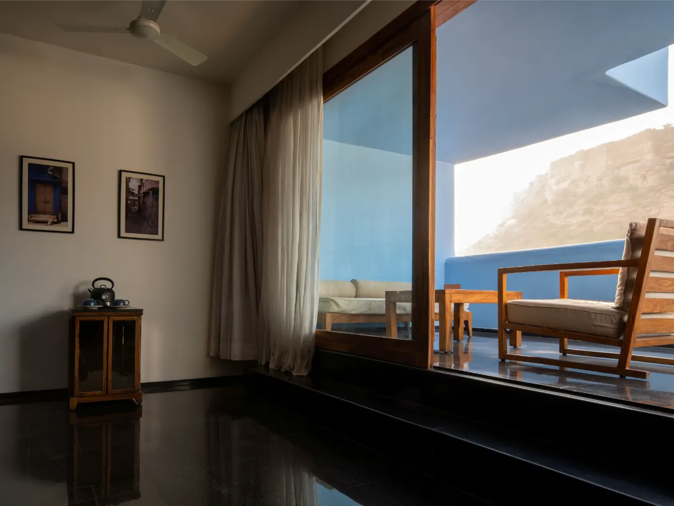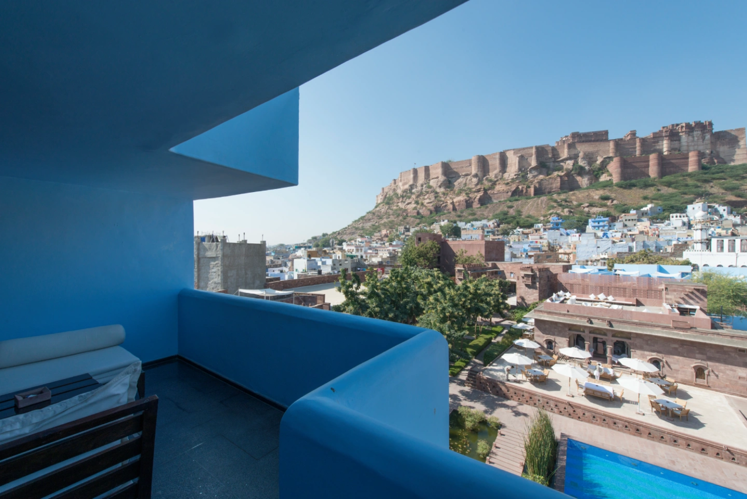 Our four Duplex Suites are located in the modern block of the hotel. All have private balconies, where a covered seating area offers protection against both sunshine and rainfall. These have spectacular views of Mehrangarh Fort and the jewel-bright houses clustering around the steep hill. With its 740 square feet, the Duplex Suite is luxuriously spacious: consisting of a separate duplex bedroom and living room, this suite is the perfect choice for large groups or families to relax and unwind in the Blue City.