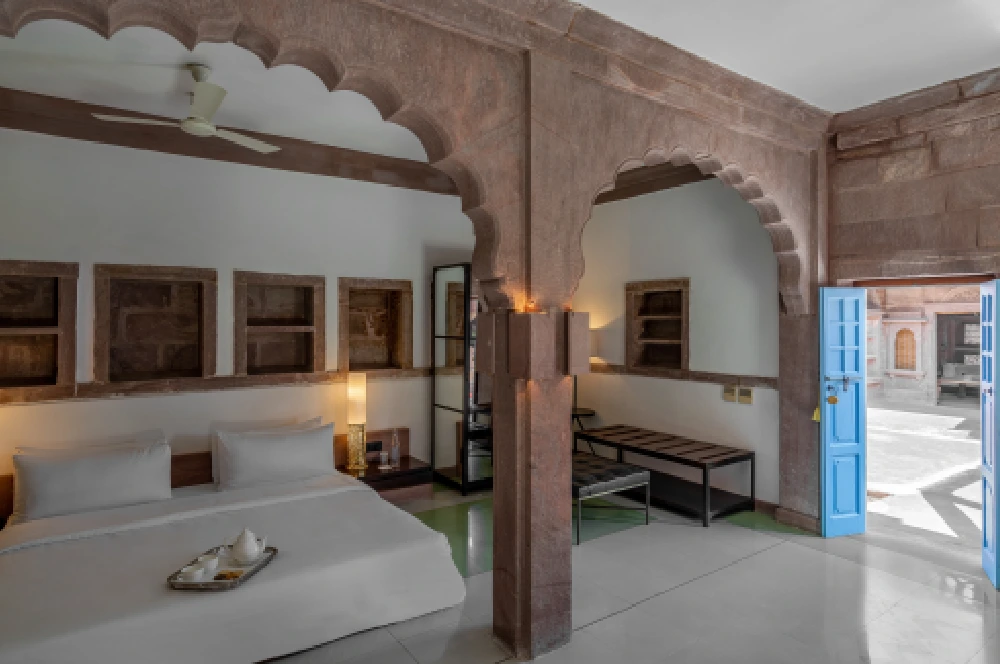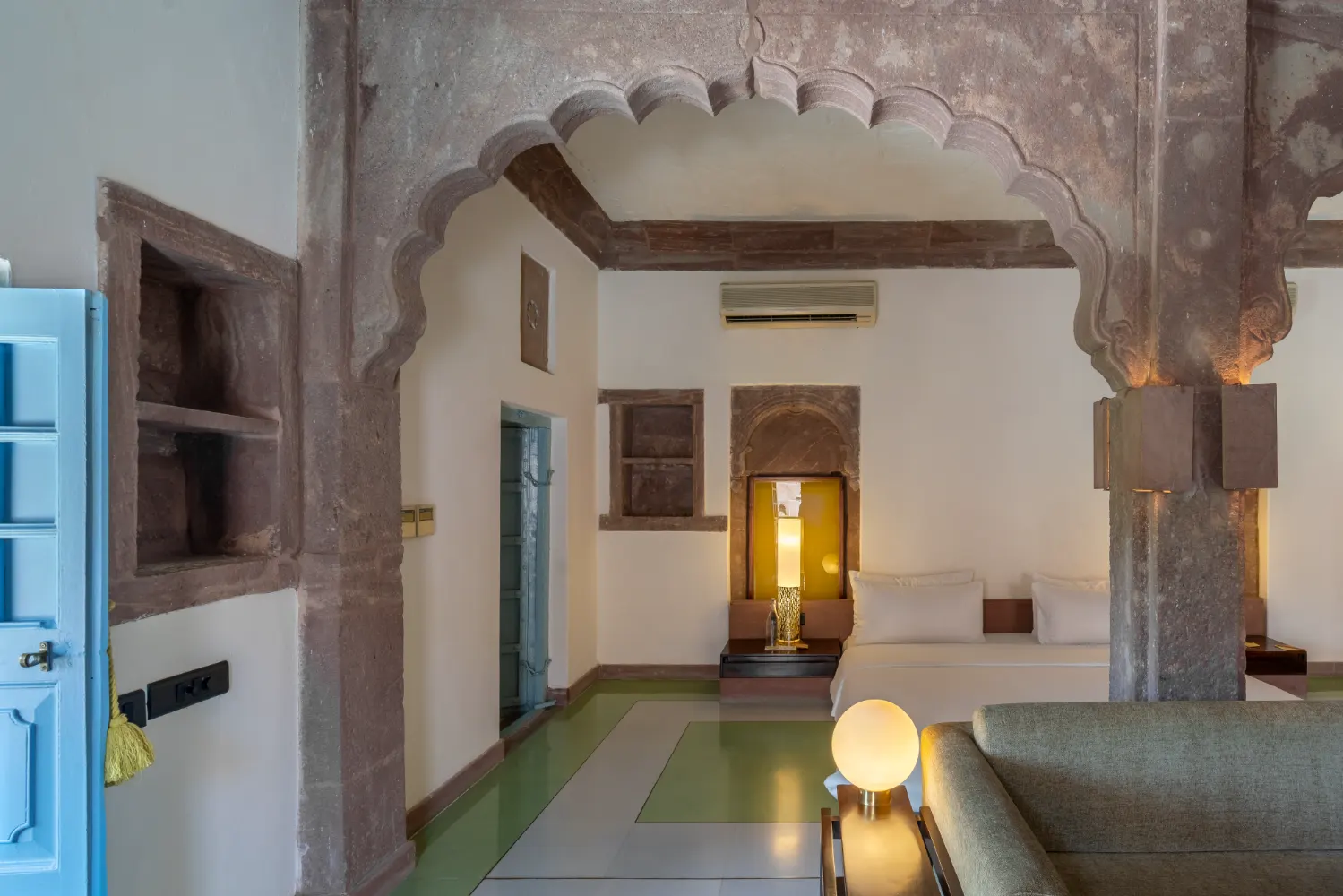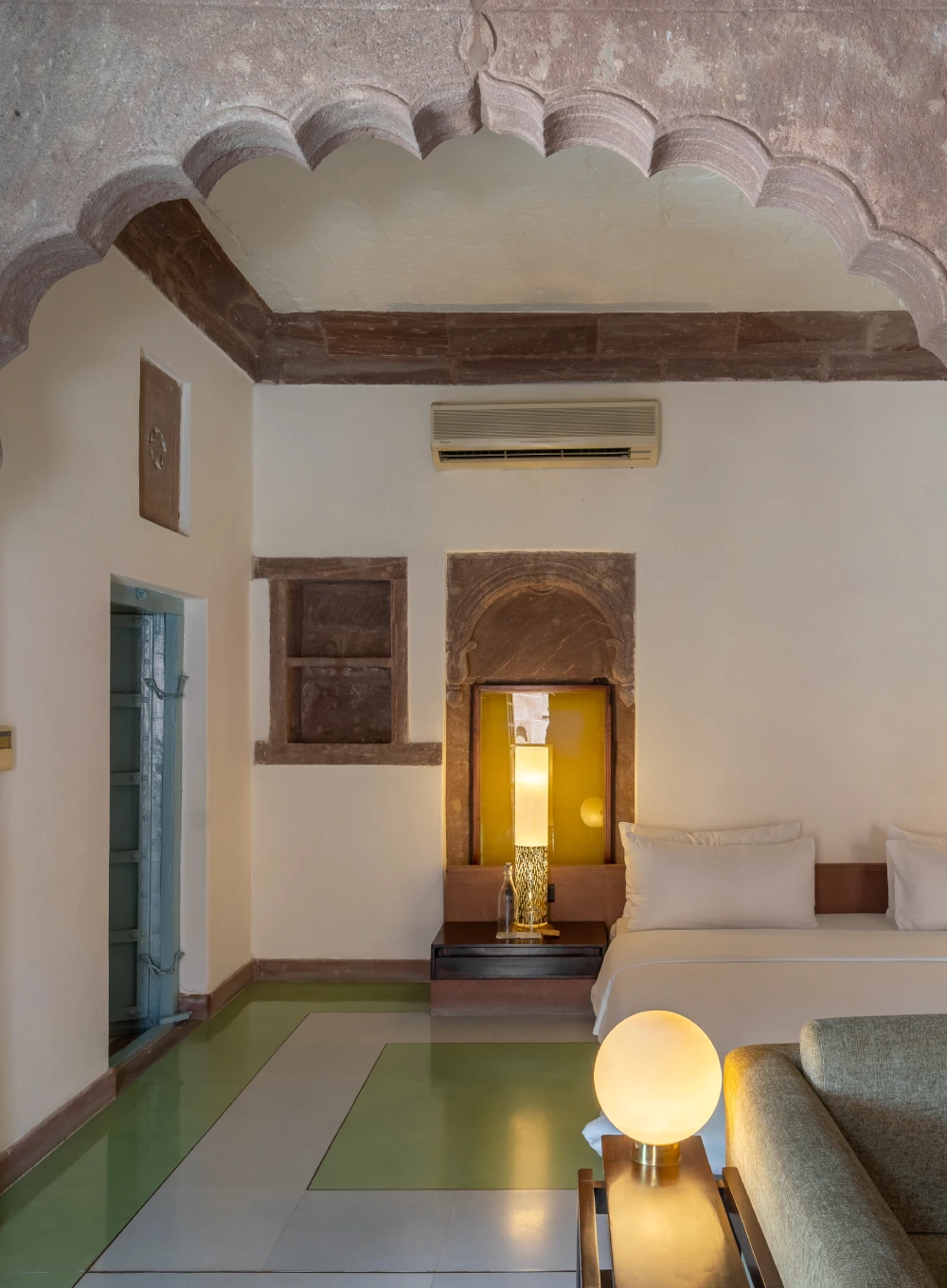 Our most lavishly decorated suites are the three Heritage Suites, located in the original 18th-century Rajput residence. Whilst preserving the old-world charm of the mansion, these suites are equipped with all modern amenities to create a luxurious blend of historic and contemporary. They each feature an ample bedroom and spacious bathroom with a separate shower and a cast iron bathtub. Staying in the Heritage Suite you will also enjoy your own terrace and private courtyard. The other two suites have their own balconies, that are connected. One of the major appeals of this suite is the breath-taking views it offers: the elevated platform in the front presents a stunning panorama of Mehrangarh Fort, while the back of the suite faces the splendidly landscaped hotel gardens.
