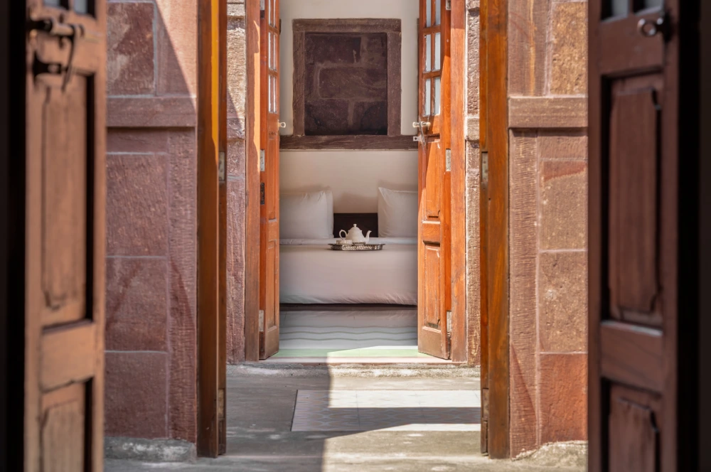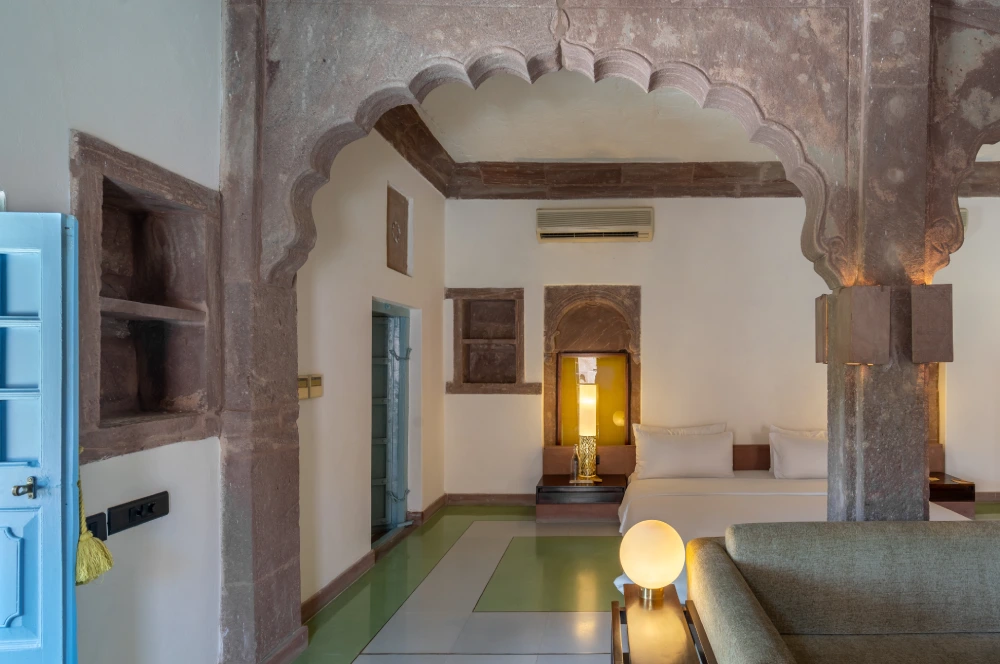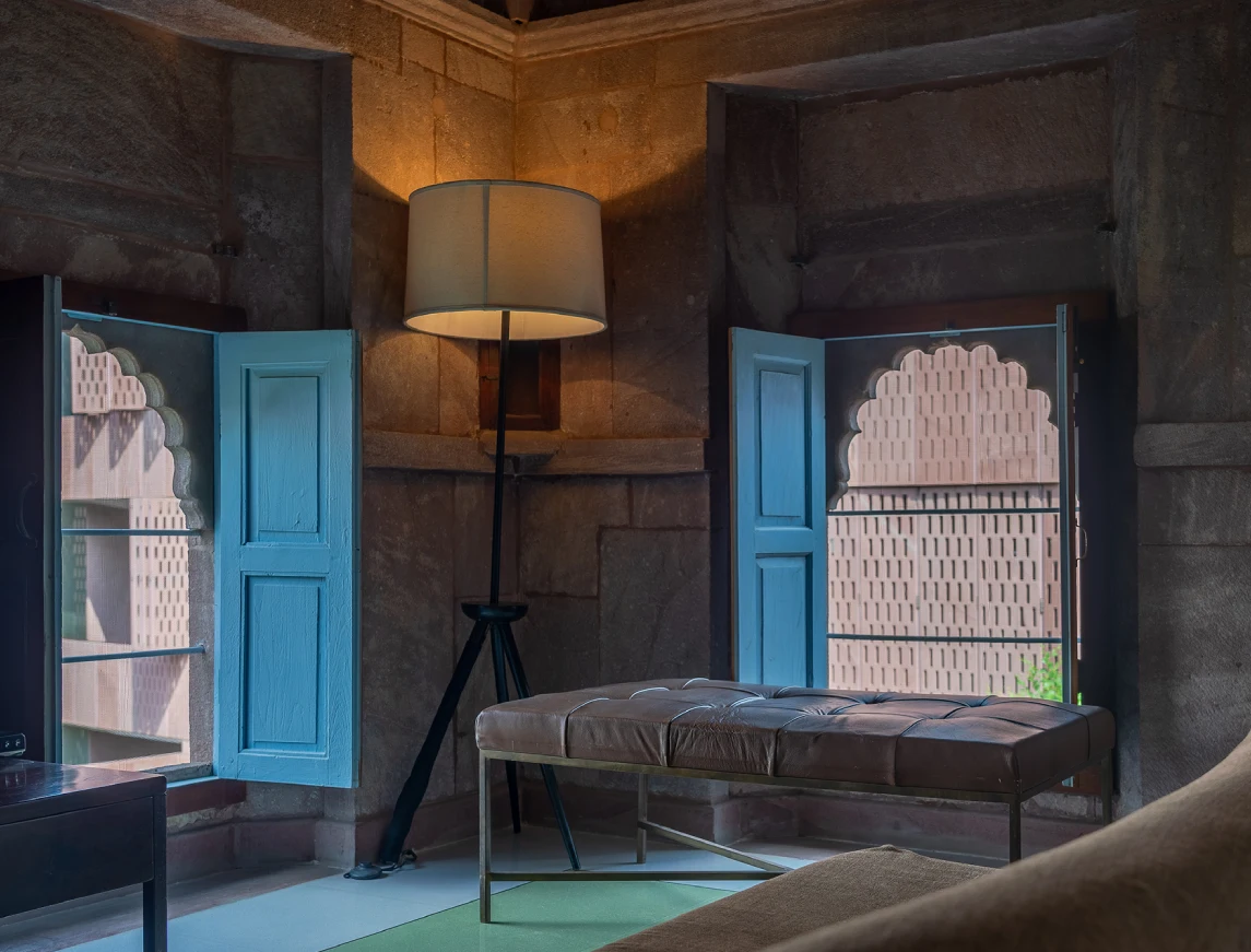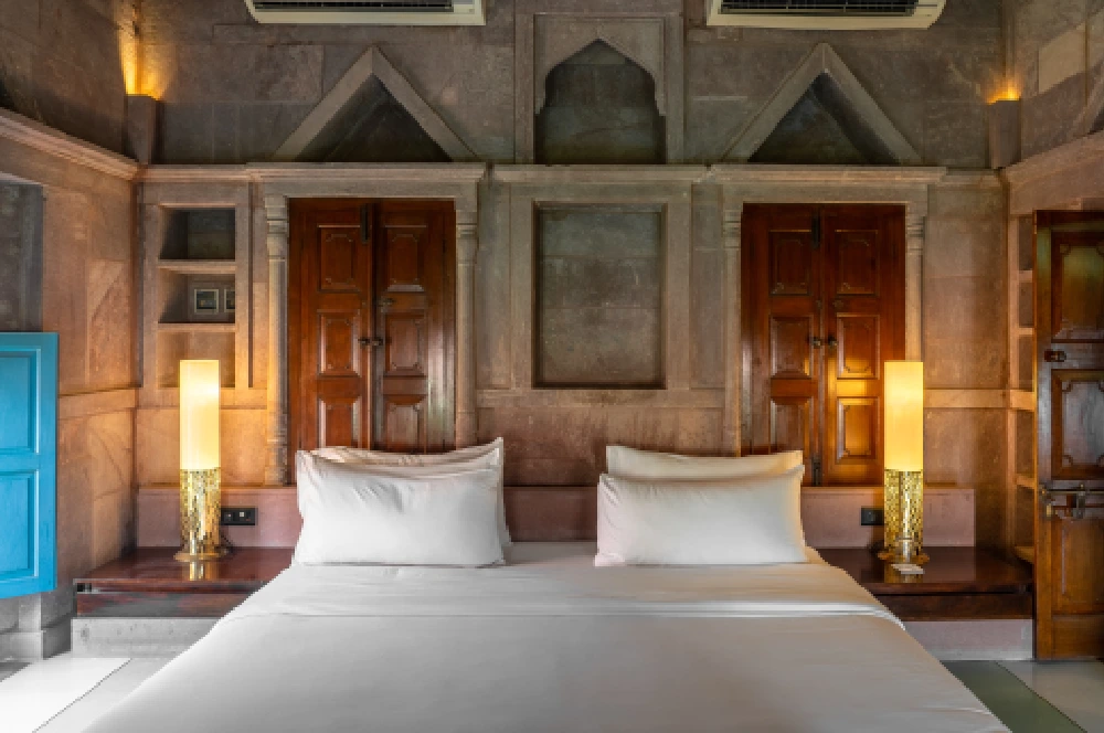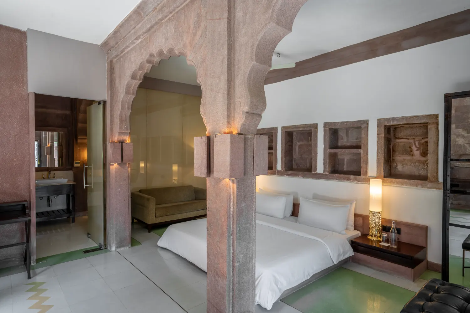 Our most lavishly decorated suites are the three Heritage Suites, located in the original 18th-century Rajput residence. Whilst preserving the old-world charm of the mansion, these suites are equipped with all modern amenities to create a luxurious blend of historic and contemporary. They each feature an ample bedroom and spacious bathroom with a separate shower and a cast iron bathtub. Staying in the Heritage Suite you will also enjoy your own terrace and private courtyard. The other two suites have their own balconies, that are connected. One of the major appeals of this suite is the breath-taking views it offers: the elevated platform in the front presents a stunning panorama of Mehrangarh Fort, while the back of the suite faces the splendidly landscaped hotel gardens.